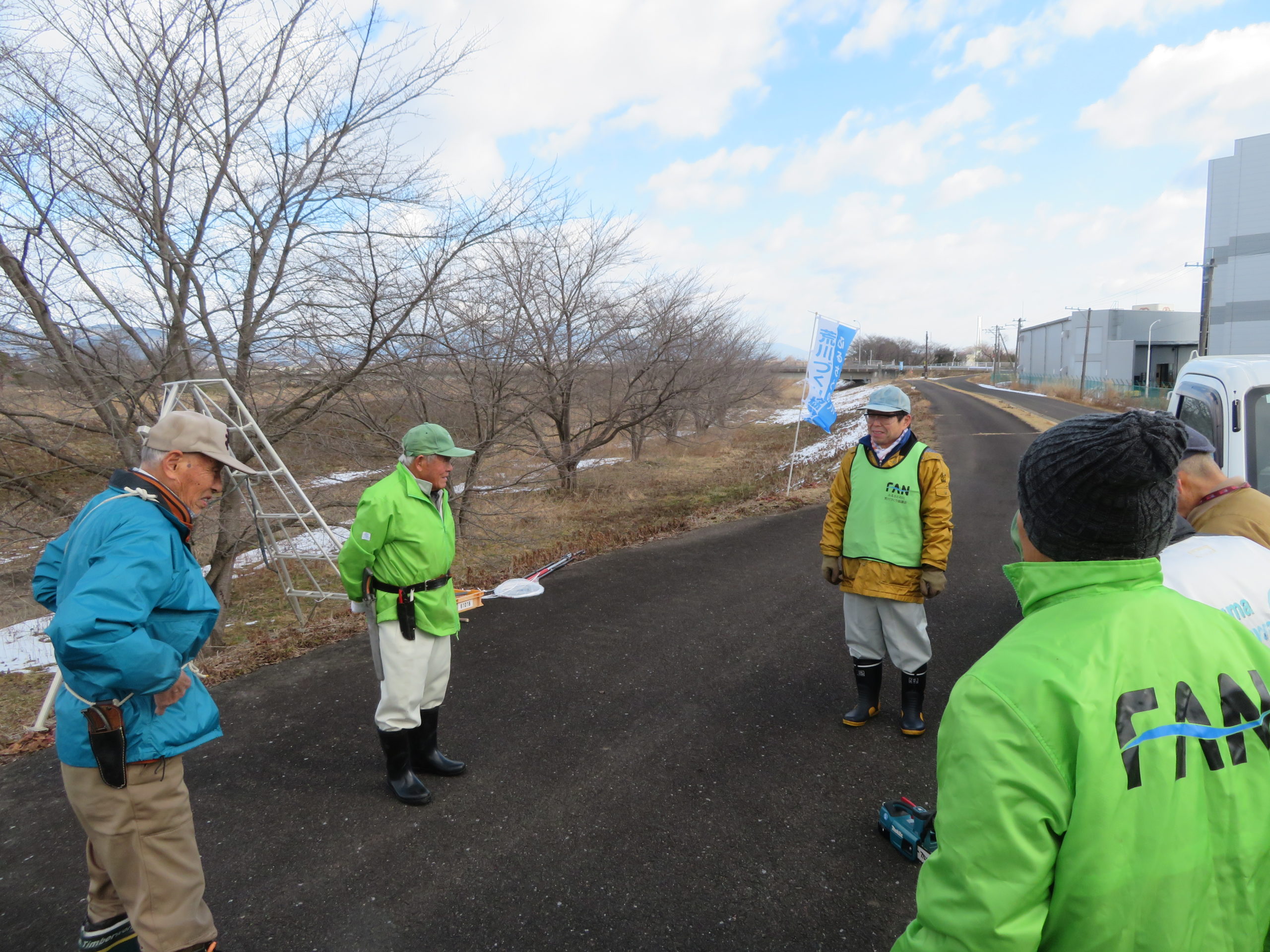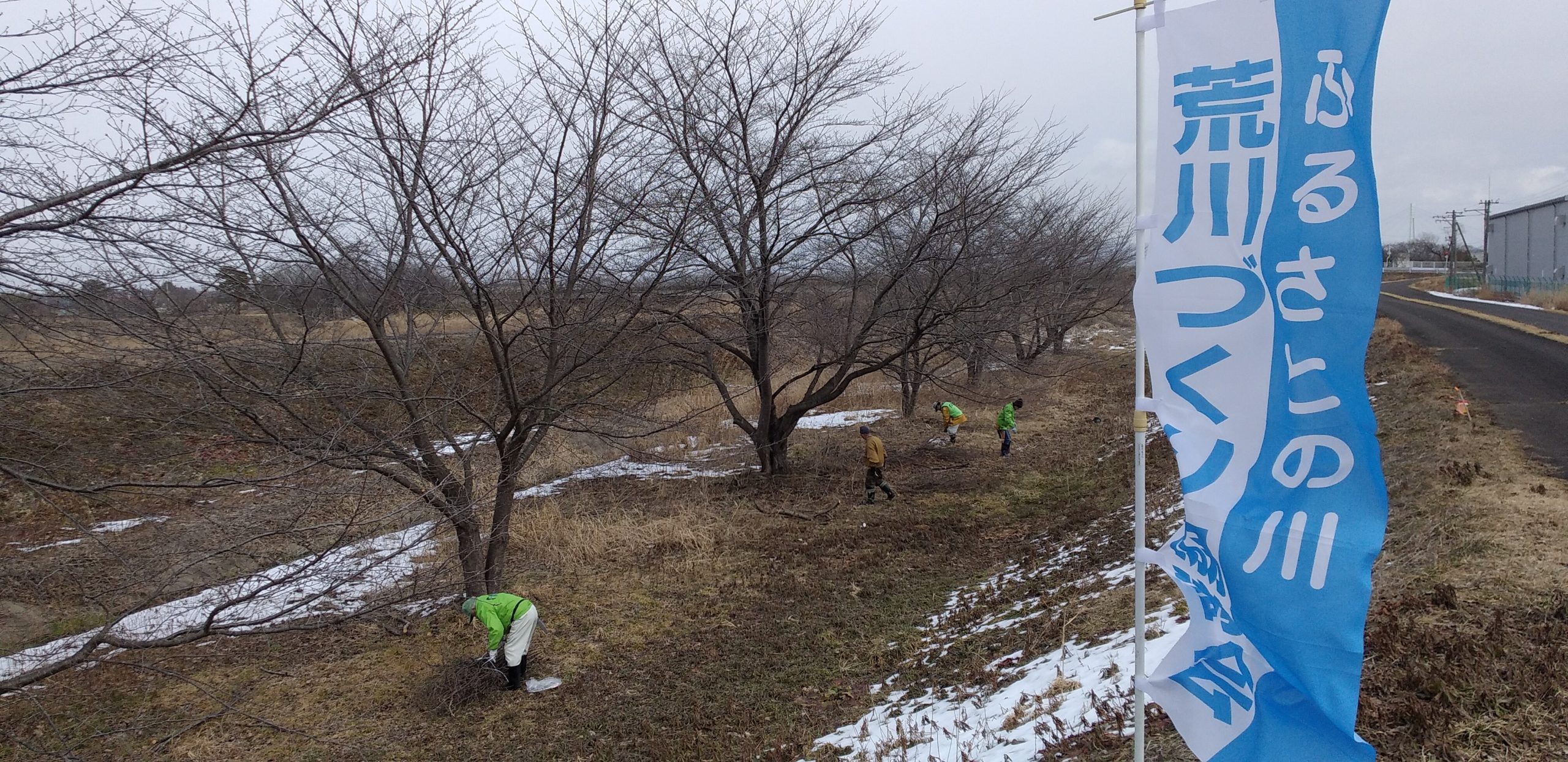 荒川桜並木の手入れ、今回は2月24日(月)さくら橋上流右岸の福島キヤノン北側の桜並木のせん定作業を行いました。毎年環境保全活動の一環として行っているもので、会員9名で桜の樹形を整えました。