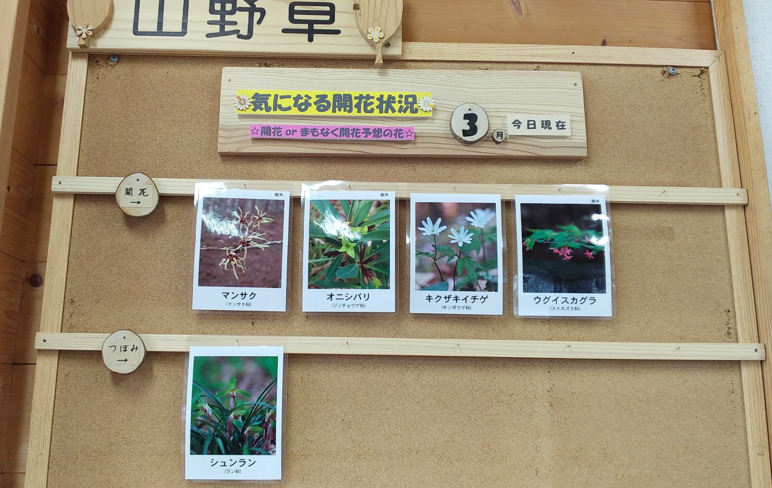 荒川流域、小富士橋近くにある「水林自然林管理事務所」内に、林内に植生する植物の開花状況が掲示されており、訪れる方に好評です。流域の林内を暖かい風が通り抜けています。